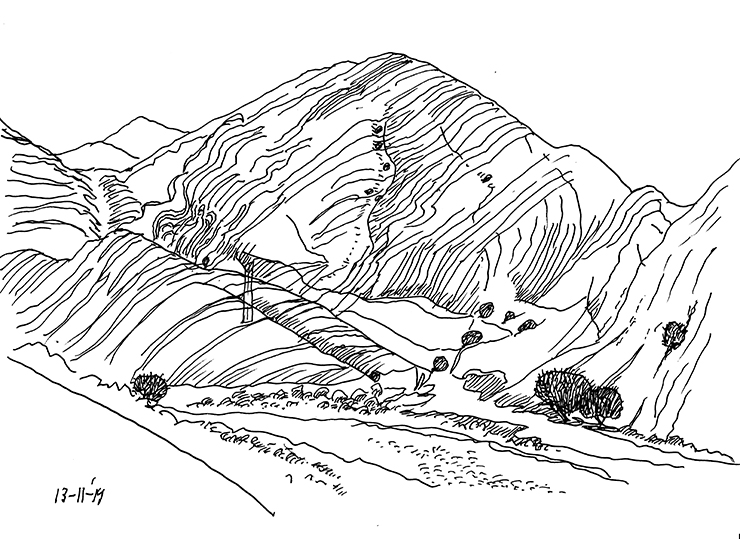 De zuidgrens van Marokko liep tot 1975 langs de bedding van de rivier de Draa langs de zuidzijde van de Anti Atlas. Na de dood van Franco nam Marokko met toestemming van Spanje, maar zonder medezeggenschap van de lokale bevolking de Spaanse kolonie de Westerse Sahara over. Daarmee strekte het land zich langs de Atlantische Oceaan uit tot aan Mauretanië. Dit deel is serieuze Sahara. In het zuidelijk deel van de Anti Atlas tot aan de Draa is de macht van de Sahara ook al duidelijk voelbaar. De Draa en de stromen die het zouden moeten voeden staan meestal droog en landbouw is schaars. In de laatste decennia is dat duidelijker zichtbaar geworden. Ooit was de Draa een leven gevende rivier en de vele rotstekeningen en archeologische vonsten getuigen er nog van. Als er tegenwoordig regen valt is het meteen met bakken. Zo erg dat er ‘flash floods’ ontstaan met ruïneuze werking. Zoals in het najaar van 2014 toen de zuidkant van de Anti Atlas getroffen werd door heftige overstromingen. Het voordeel was wel dat de stuwmeren weer opgevuld werden en voor het eerst in tien jaar de heuvels weer kleurden met bloemen. En zoals altijd op zo’n bijzonder moment zijn er kinderen die nooit eerder de wilde bloemenweelde gezien hebben. Onderschrift: waar de acacia’s staan is het punt waar de ene droge bedding de ander ontmoet.