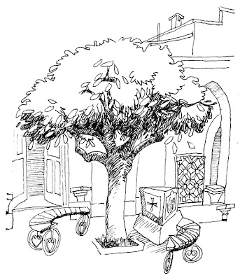 Een week na het aftreden van Mubarrak in Egypte verscheen er een Blog op het internet onder de titel A Gay Girl in Damascus ondertekend door ‘Amina A’. Deze Blog ging in eerste instantie over hoe Moslima’s toch Lesbisch en gelovig konden zijn. Mijn ogen stonden op steeltjes toen ik de Blog voor het eerst las. De Arabische Lente had duidelijk ook de plaatselijke LGBT’s aangestoken. Dat was nog eens revolutie! Gaandeweg werd de Blog steeds politieker en actueler. ‘Amina A’ bleek geïnformeerd, kon goed schrijven en gaf solide achtergrond informatie. In het ‘Lesbische’ deel van de Blog werd weliswaar een heel rooskleurig beeld geschetst, maar goed, van het begin af aan was ervoor gewaarschuwd dat de Blog fictie was met hier en daar wat werkelijkheid. In de loop van april werd de Blog zelfs toonaangevend omdat veel Engelstalige nieuwsbronnen buiten en binnen Syrië onbetrouwbaar bleken en er geen journalisten het land in mochten. Een vriend van mij had contact met ‘Amina A’ en mocht van de Blogger alles uit de Blog halen wat hij kon gebruiken. Het was bijna te goed om waar te zijn. En inderdaad, twijfel over de identiteit van ‘Amina A’ ontstond toen de Blogger die de Syrische en Amerikaanse nationaliteit zei te hebben niet te traceren viel. Op 6 juni ontmaskerden de internet detectives ene Tom MacMannus als ‘Amina A’. Het feit blijft dat veel van de artikelen en opinies op de Blog informatief en interessant waren. Deze tekening is gemaakt in het museumpje van Maarrat An Numan waarover ‘Amina A’ uitgebreid heeft bericht o.a. over de kannibalistische Kruisvaarders die de Moslims rauw lustten.