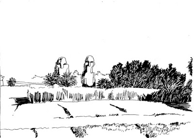 Apiculture was popular in the whole of Egypt but particular in the Delta region. Hives were made of mud or reeds covered with mud. Empty hives were also used as wall insulation of houses. The cylindrical hives were stacked horizontally, sometimes up to 500 together. The harvesting was done twice a year: in spring and autumn. Because of the climate there seem to have been no winter hibernation. The hives were transported to where the flowers were. They had to be moved again when the farmers were clearing the ground by fire after harvest or when the Nile water rose and it was necessary to bring the hives to higher ground. The moving could cause some logistic problems especially when there were many hives involved. It is all written down in queries, prayers and petitions and mercifully kept for prosperity. The drawing is of fields on the banks of the Nile and two huge statues near Luxor