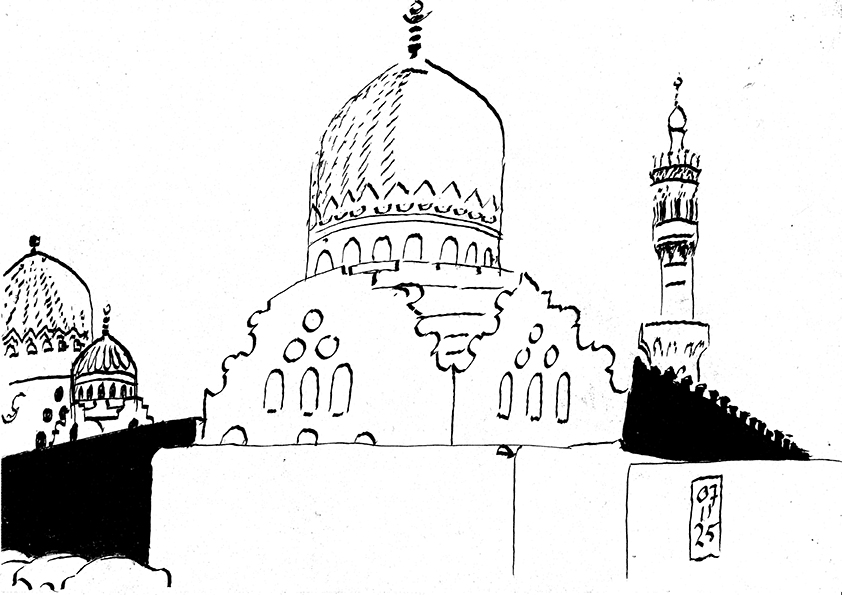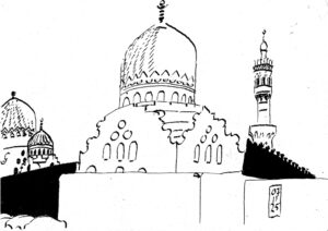 Turkish minarets are all the same. That’s why I hate to draw them. But sometimes there is one ot two that are irresistable. In the first half of the 16th century Egypt was conquered by the Ottoman Turks who had there imperial seat in Istanbul. The Ottomans had a desire for bureaucratic uniformity and keeping the status quo. Countries under their rule fell into a debilitating stupor. Egypt also. Gone was the architectural, cultural and intellectual sparkle that had made Cairo the most exiting city of the time. Although sometimes a Mamluk governor still tried to stir-up something.