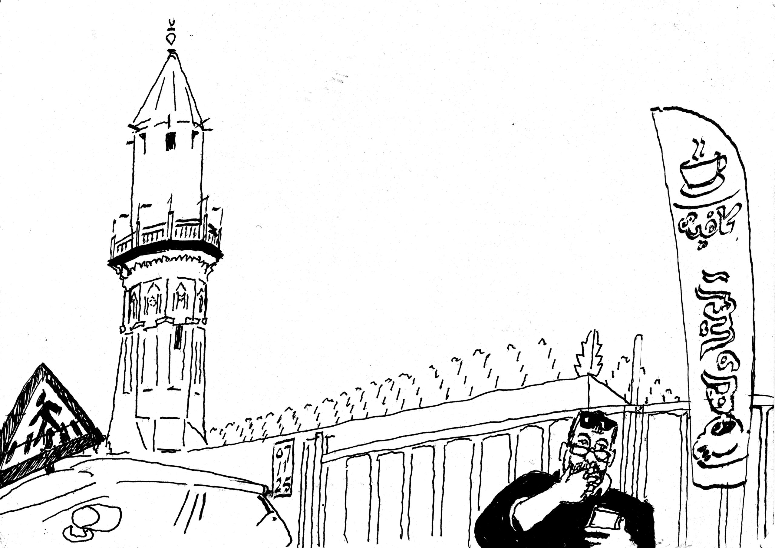 Cairo heeft de mooiste minaretten ter wereld en de ‘primus inter pares’ is toch wel de minaret van de Ibn Tulun moskee. Dus toen ik het idee opvatte om al dat schoon te gaan tekenen moest ‘Ibn Tulun als eerste vastgelegd worden. In de vroege ochtend streek ik neer in een theehuis vanwaar uit ik goed zicht had. De stad lag nog in de schaduw, maar de minaret baadde al in het vroege ochtendzon.