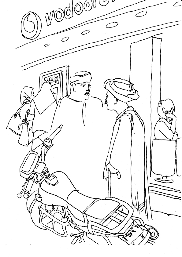 30 Geld is schaars in Egypte. Het geld dat er is wordt geclaimd door een minimaal segment van de bevolking en door hen vaak snel op buitenlandse bankrekeningen overgeheveld. De inkomsten uit werk zijn niet veel. Egypte produceert zelf weinig en erg veel producten zijn geïmporteerd en daardoor nagenoeg onbetaalbaar. Er zijn slechts twee manieren waarop geld in het publieke domein van de ‘gewone man’ gebracht wordt: via toeristen en migranten. Op deze tekening staan vier zaken die te maken hebben met geld: vervoersmiddelen, verhandeling van cash, geld via de bank en communicatie. De meisjes die geld uit de muur trekken, kunnen dat alleen als er ook geld op de bank staat. Een chauffeur beweerde dan ook dat alleen mensen die voor de staat of andere officiële instellingen werken de cashmachines ‘mogen’ gebruiken. De Fellahin heeft niets met de bank. Hij kent alleen cash die hij bijna letterlijk ‘onder de matras’ bewaart. Er is daarom nog steeds of alweer een ‘zwarte’ markt waarop de vreemde valuta die hij wil bemachtigen of via toeristen of migranten in handen krijgt, verhandeld wordt. Vervoersmiddelen zoals deze goedkope brommer uit China, maar ook busjes, bootjes en tuk-tuks zijn vaak een noodzakelijke luxe. Het cash geld ervoor, vertelde ons een veerman, wordt door een geldschieter voorgeschoten. Dat is meestal iemand die het geld in één van de oliestaten heeft verdiend. Van iedere inkomsten uit gebruik verdiend, gaat vier-vijfde naar de geldschieter. Pre-pay mobiele telefoons zijn de middelen van communicatie van de gewone man. Alle providers zijn in buitenlandse handen ook de Egyptische. Dus eigenlijk te duur voor de Fellahin. (10 Egypte 15)