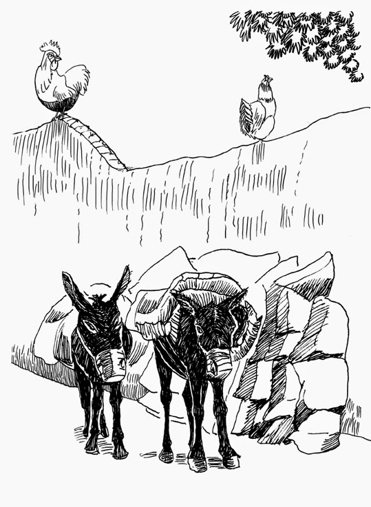 We gingen met de trein van Meknes naar Fes. Het is een rit van een half uur door een glooiend vruchtbaar landschap. In het niemandsland tussen het spoor en de voorsteden van Fes zagen we de hutten van todden en bouwafval en hun bewoners de vluchtelingen uit de Sub Sahara. Er wordt geïnvesteerd het bestaande spoornet tussen de grote centra en in 2009 is er de nieuwe lijn tussen Nador en Taourirt aan toegevoegd. Het station van Fes is nieuw en de hal is ruim en overzichtelijk. Het ligt in een moderne uithoek ver van de Medina waar wij zoals gewoonlijk een B&B hadden. Het was een wereld van verschil. Aan de rand van de oude stad zette de taxi z ons op het stoffige parkeerterrein voor de Bab Guissa af. De Bab en de belendende moskee werden gerestaureerd. Er liep een smal straatje omheen langs een muur met een tuin erachter. We huurden een ezeltje voor onze bagage en doken letterlijk een Soek in. De weg kronkelde stijl naar beneden. Het was weinig breder dan de ezel en tegemoetkomende wandelaars moesten deuropeningen instappen om de ezel doorgang te verlenen. Het gonsde van de bedrijvigheid. Op de tekening is de bedrieglijk landelijk straat te zien achter de Bab Guissa met de geduldig wachtende vrachtezels en de trots rond dribbelende buurt haan met één van z’n kippen. Het bleek onmogelijk ter plekke een portret van hem te maken en Bert had ook al moeite hem te fotograferen. (59)