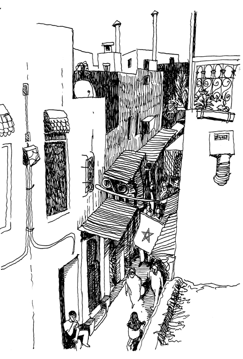 Marrakesh ligt in de Haouz een vruchtbare vlakte aan de voet van de Hoge Atlas. Het klimaat en de watervoorziening is er gunstig. Doordat er naast het water dat van de bergen komt er ook regelmatig een bui valt, stroomt het water niet alleen weg in rivieren, maar siepelt het onder de grond en blijft. Door deze gunstige omstandigheden hebben Berbers de plek al sinds neolithische tijden bewoond. In de tweede helft van de 11de eeuw is Marrakesh gesticht door Joesoef een telg uit de Berber dynastie der Almoraviden. Joesoef heeft samen met zijn vrouw Marrakesh van kampement tot stad gemaakt. Zij hebben Marrakesh het karakter gegeven van stad te midden van de palm- en olijfgaarden. Dat nu nog gekoesterd wordt. Joesoef heeft de watervoorziening veilig gesteld door een systeem van Khettara aan te laten leggen. Hij en zijn vrouw schaften ook alle belastingen af, behalve die genoemd zijn in de Koran. Hierdoor kon de handel en kunsten opbloeien. Onder hen werd Marrakesh ook het centrum voor de trans Sahara handel en kreeg het contact met de rest van de Maghreb. Helaas zijn veel van hun bouwwerken vernietigd door de dynastie die na de Almoraviden kwam: de Almohaden. Marrakesh als zetel van de macht sprak sindsdien zo tot de verbeelding dat ‘in het buitenland’ de namen Marokko en Marrakesh onderling inwisselbaar werden. Onderschrift: In de Medina van Marrakesh (62 Marokko)