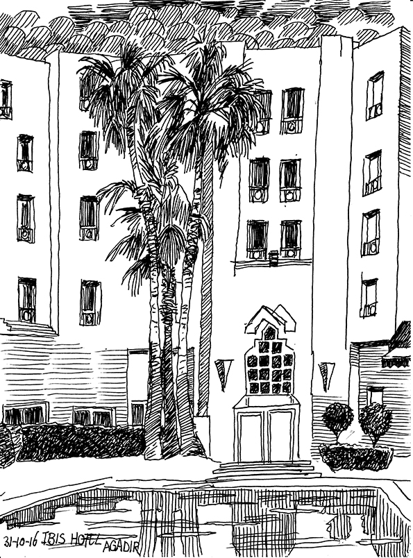 On the last day of October 2016 Bert Hogervorst and I met up with Aicha Aboudamiaa in the Ibis Hotel in Agadir where we were staying prior to our flight back to Amsterdam. Bert and Aicha welcomed each other as old friends. It was the first time I met Aicha. Still Bert didn’t know much about her. She is a daughter of Imam Aboudamiaa the descendant of the first ruler of Iligh: Ali Aboudamiaa. Bert had told me that the name in Arabic meant literally ‘Father of Tears’. One could only speculate what it stood for. Aisha didn’t have the answer there on that day in Agadir. Aisha told us that her father wanted to get international interest in Iligh and its history. Aisha was supposed to do that, but she has a full-time job in Agadir and not the time nor the connection. Could we help? I thought: I don’t think so! Bert told her about our visit to the Jewish museum in Casablanca and our talk with Zhor Rehilhil director of the museum. Bert told Aicha that she should get in touch with Zhor. The museum is very well endowed and Iligh obviously isn’t. But Zhor wants proof of the many documents in Hebrew that are supposedly in Iligh. Aisha tells us that her father doesn’t want any of the documents to leave Iligh not even for preservation and documentation purposes. He has been in contact with the government minister in charge with the national heritage. He is afraid that once the historical papers are in Rabat, he will never get them back. Her father wants to get the international focus on Iligh in the hope that that way enough money will be generated to get the documents saved without interference from up high. After excuses that nobody had been in Iligh to open the door for us when we were there, I showed Aicha the drawings I had made there. The one of the Zaouia and the two in the part of the stronghold that is open to the public. She likes them very much and asked point blank if I want to come back a.s.a.p. and make more drawings.