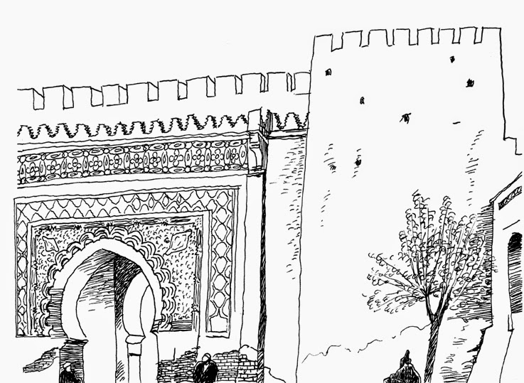 Moulay Ismail regeerde ten tijde van onze Gouden Eeuw in een periode dat de Europese machten hun posities in Marokko probeerde te versterken. Maar met een staand leger van slaven en toegewijde bedoeïen en de hulp van Barbarijse zeerovers wist hij het tij te keren en zijn macht te consolideren. In de 54 lange jaren van zijn regering zette hij zijn stempel op Meknes met vele grote bouwwerken. Als bouwvakkers werden tot slaven gemaakte Europeanen gebruikt. Buitgemaakte christelijke vrouwen werden slavinnen in zijn hofhouding. De Marokkanen zijn vooral onder de indruk dat hij 500 vrouwen had en duizend kinderen. Dit alles leverde hem bij ons een reputatie op van extreme bloeddorstigheid en hedonisme. Maar wat het echt opleverde was dat na zijn dood een burgeroorlog uitbrak en Meknes zijn positie als hoofdstad kwijt raakte aan Fes. Op de tekening staat één van de prachtige poorten die hij liet bouwen de Bab Berdaine. Ik koos deze poort om te tekenen omdat het een redelijk simpel bouwwerk was. Terwijl ik zat te werken, kreeg ik gezelschap van een keurig geklede en verzorgde debiele jongen. Ik had in eerste instantie nogal last van hem, maar toen Bertje zich er mee ging bemoeien en hem afleidde met foto’s in de reisgidsjes kwam het helemaal goed en namen we als goede vrienden afscheid van elkaar. (44)