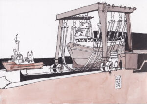 Op mijn tochten rond de voormalige Lauwerszee kwam ik op idee om eens een andere tekentechniek te gebruiken. In plaats van een Lamy vulpen met niet watervaste zwarte inkt vullingen en goedkoop schetspapier, wilde ik ‘gewassen’ tekeningen proberen te maken met vulpennen met watervaste inkt, grafiet potlood, met water aangelengde inkt op aquarelpapier. Het was niet altijd een succes. Vooral in het begin gebruikte ik verkeerde inkt en verkeerd papier.