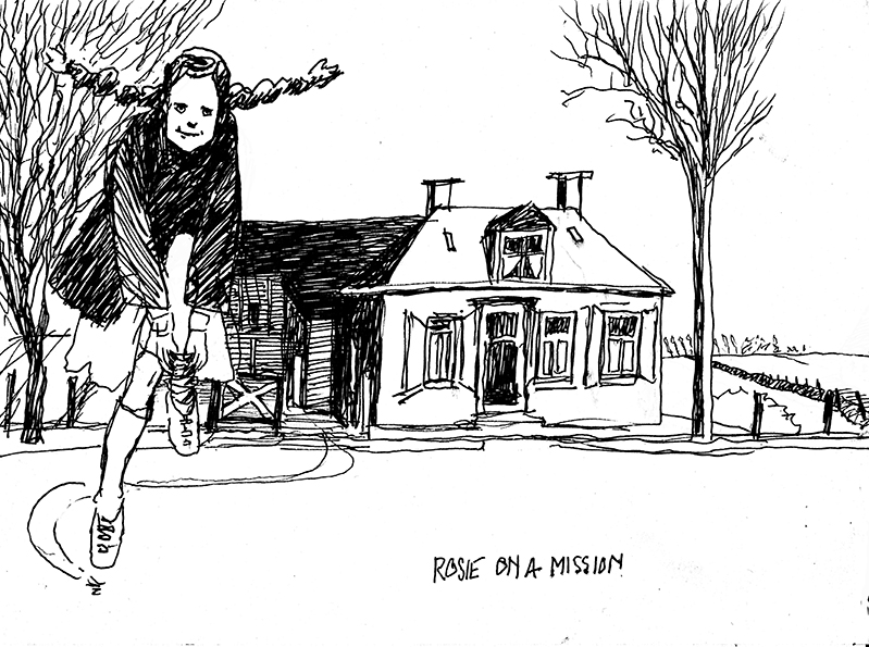 ‘Rosie’ is de hoofdpersoon in een serie verhalen die Doutsje Nauta in de afgelopen 15 jaar voor de Achill Writers Group heeft geschreven. Rosie is haar alter ego. In 2020 tijdens het jaar van Covid-19 heeft ze de Rosie verhalen uit de kast gehaald. Ze vroeg mij of ik er niet eens wat ‘bij wilde tekenen’. Ik wilde dat wel proberen. Dus vanuit Polranny ging ik mij wagen in te leven in een Fries meisje dat opgroeide op een boerderij in de buurt van Snits/Sneek tussen 1960 en 1970