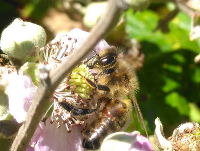 Beekeeper Timothy Stevens has put a new entry on Facebook that I like to copy here. ‘Here is a very lucky or even unlucky photo. It shows a bee foraging on bramble. On closer inspection you can see a varroa mite on her. It looks like a purple disk on her side. The mite has wedged it’s self in between the plates on the bee. This is the real face of one of the major reasons honey bees are dying and why almost all wild hives are dead. Because of these little mites I have to treat my hives to kill the mites. I have never seen a mite on a bee outside the hive. On a brighter note the weather today has been very good and if this continues I should receive some honey in return for my years toil. I usually remove the excess honey on the 10th of August however with the weather being so cold it has held the blackberry back and put my schedule back as well.’