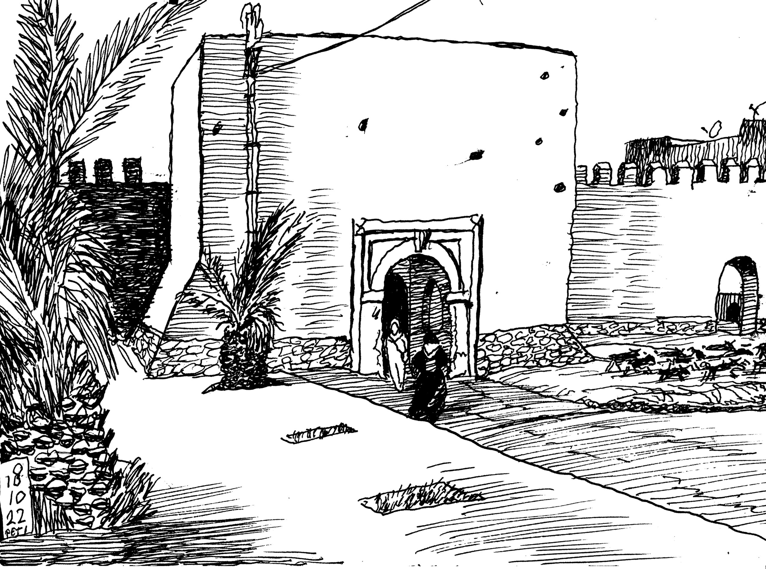 Eenmaal veilig geland in de Riad Janoub werd mijn eerste tekenplek die heerlijke kleine poort in de grote muur die Tiznit omgordt. Die Bab Al Maader waar net een auto door kan, tekende ik eerst van buiten en toen van binnen. Toen wist ik dat ik weer helemaal terug was in Tiznit.