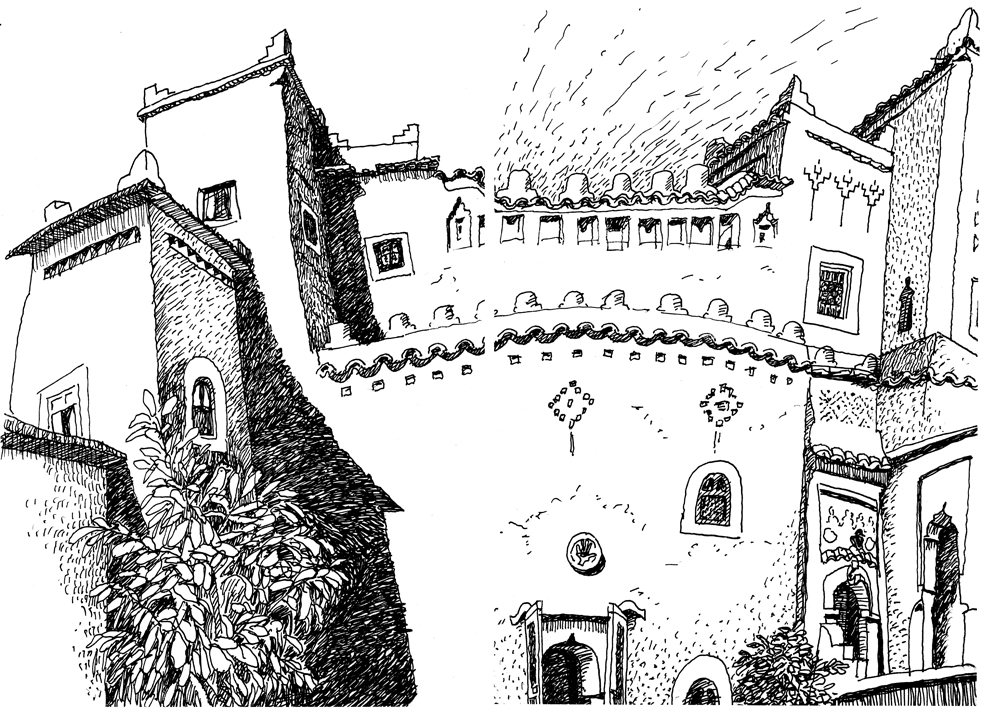 Een Ksar is een voorbeeld van Berber architectuur dat ook bekend is in Spanje (Alcázar) en Portugal (Alcácer). Ksars komen vooral voor in het deel van de Maghreb dat aan de Sahara grenst en dus ook in de Draavallei. Een Ksars is een verdedigbaar dorp dat uit leem of uit leem en steen is opgetrokken. De Ksar aan de rand van Agdz in de Draavallei was jarenlang een gruwelgevangenis van het repressieve regiem. Nu wil men er ter herinnering een museum van maken. In de film ‘The Sheltering Sky’ van Bernardo Bertolucci was het de Franse garnizoens kazerne. Net als een Ksar is een Kasba ook uit leem of leem en steen opgetrokken. Architectonisch is een Kasba van buiten vaak minder streng, maar verder is het moeilijk een onderscheid te maken. Het woord Kasba heeft meerdere betekenissen. Zo is het een fort in de Medina zoals in Marrakesh. Soms wordt de hele oude stad Kasba genoemd zoals in Tamagroute. Op het platteland wordt de woning van het dorpshoofd Kasba genoemd. In dat geval ligt het dorp buiten de hoge muren van de Kasba. In Agdz logeerden we in de oude Kasba van de familie van Abdelzack Ait El Caid. Abdelzack en zijn vriend de cineast Kamal El Kacimi hebben het totaal vervallen gebouw gedurende een acht jaar durende renovatie teruggebracht in de oude glorie. Abdelzacks grootvader Caid Ali was de laatste van het geslacht die nog de rechten van grootgrondbezitter had. Op foto’s is hij te zien met Generaal Lyautey de grondlegger van de Franse koloniale macht in Marokko. In 1956 direct na de onafhankelijkheid is Caid Ali gestorven.(18 Marokko)